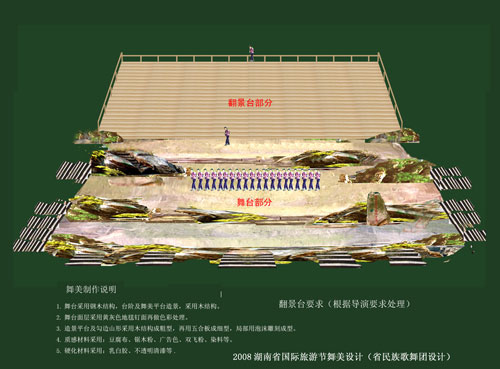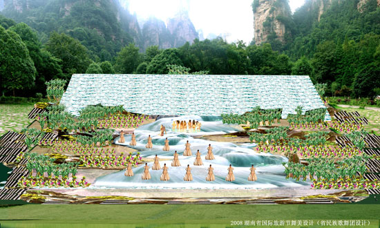 2008中國(guó)湖南國(guó)際旅游節(jié)開幕式舞臺(tái)設(shè)計(jì)新穎、舞美布局流暢大氣,在張家界以往的大型活動(dòng)中首次采用千人翻版作為舞臺(tái)活動(dòng)背景,加大內(nèi)容的信息量是本次旅游節(jié)活動(dòng)中的藝術(shù)靚點(diǎn),將音樂、舞蹈、造型、翻版圖案與自然風(fēng)景有機(jī)結(jié)合,充分體現(xiàn)了旅游節(jié)開幕式總導(dǎo)演對(duì)整個(gè)實(shí)景演出的創(chuàng)作意圖,在最短的時(shí)間,用最直觀的方式給觀眾帶來強(qiáng)烈的視覺沖擊,以表層和表意相結(jié)合的藝術(shù)手段凸顯張家界的風(fēng)景、風(fēng)俗、風(fēng)情,及歷史的縱深內(nèi)涵,達(dá)到張家界天人合一、神形兼容的絕美境界。