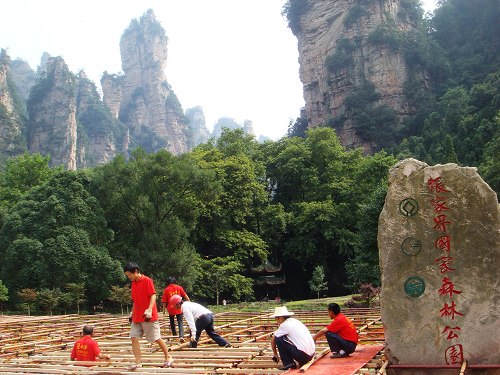 2008中國湖南國際旅游節(jié)開幕式舞臺位于世界自然遺產(chǎn)張家界國家森林公園老磨灣,根據(jù)導(dǎo)演組的舞臺美術(shù)設(shè)計,分為主體演出舞臺和方陣舞臺,總面積1600多平方米,總共將容納1600人同臺演出。其中主體舞臺長40米、深度為31.5米、高1.5米,方陣舞臺為42米長、深度9.5米、最高達10.5米的弧型階梯式舞臺。整個工程共需要使用25噸左右的鋼管,舞臺表面每平方米能夠承重600公斤以上。