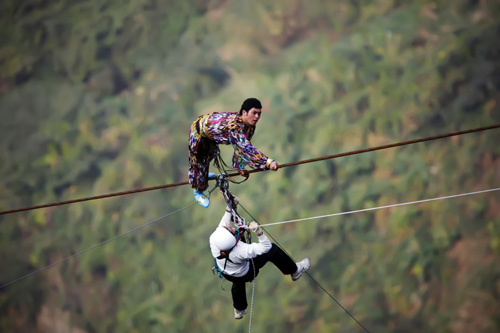 10月18日,新疆達(dá)瓦孜傳人賽買提·艾山在張家界天門(mén)山景區(qū)進(jìn)行目前世界最大坡度39°高空鋼絲的極限挑戰(zhàn)的途中發(fā)生意外,在距離終點(diǎn)約50米處跌坐在鋼繩上,最終被迫放棄挑戰(zhàn)。具精確統(tǒng)計(jì),本次挑戰(zhàn),賽買提·艾山行走的長(zhǎng)度為650米,鋼繩坡度為39°,所用時(shí)間為49分鐘,雖然沒(méi)有到達(dá)原計(jì)劃的700米終點(diǎn),但是他也已成功挑戰(zhàn)了目前世界最大的高空鋼絲坡度39°。意外發(fā)生后,天門(mén)山景區(qū)預(yù)先安排的安全人員立即展開(kāi)救援,歷時(shí)1個(gè)多小時(shí)將賽買提-艾山順利從鋼繩上救下。