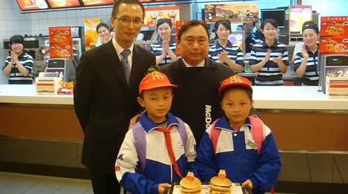 張家界市人大副主任王海生(后排右一)在麥當(dāng)勞湖南、武漢、浙江市場營運總監(jiān)李輝的陪同下,親自制作了張家界解放路麥當(dāng)勞餐廳的第一個巨無霸漢堡,并贈送給當(dāng)?shù)丶彝ヘ毨У暮⒆觽儭?/P>