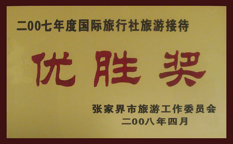 10、2008年4月被張家界市旅游工作委員會(huì)評(píng)為《2007年度國(guó)際旅行社旅游接待優(yōu)勝獎(jiǎng)》