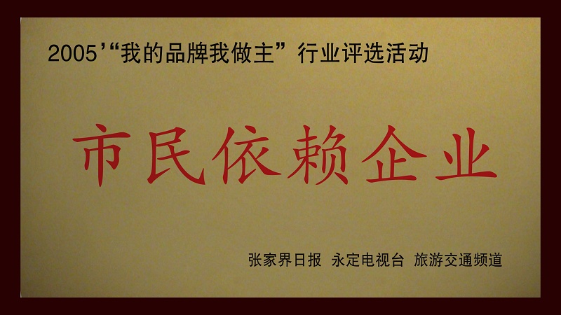 5、被張家界日?qǐng)?bào)、永定電視臺(tái)、旅游交通頻道共同評(píng)為2005"我的品牌我做主"行業(yè)評(píng)選活動(dòng)《市民依賴企業(yè)》