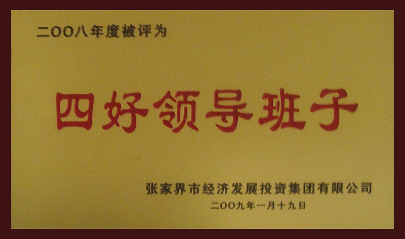 13、2009年1月被張家界經(jīng)濟(jì)發(fā)展投資集團(tuán)有限公司評(píng)為《2008年度四好領(lǐng)導(dǎo)班子》