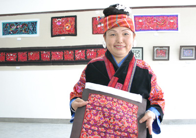 土家織錦藝術家葉水云 白布帕子四只角, 四只角上繡雁鵝; 帕子爛了雁鵝在, 不看人材看手腳。 這首山歌唱的是土家姑娘和土家織錦,對土家姑娘和土家織錦進行評價。 世居武陵地區(qū)的土家族,是一個精于紡織的民族,土家織錦便是土家族的傳統(tǒng)的工藝品,也稱“ 西蘭卡普”。土家婦女擅長紡織很早就見史籍,早在四千多年前,土家先民就掌握了簡單的紡織技術。秦漢時期,土家人的織錦被稱為“賨布”,曾是皇室的貢品。三國時期,土家人逐步掌握了漢族先進的染色技藝,能夠編織出五彩斑斕的“土錦”《華陽國志》稱之為“蘭干細布”,說它“織成文如綾錦”。唐代稱其為“溪峒布” “溪峒布”工藝已十分精湛,《溪蠻叢笑》描繪它“績五色線為之,文彩斑斕可觀。俗用為被或衣裙,或作巾,故又稱峒布!彼未院螅良胰说募徔椉妓囈严喈敵墒,能夠用絲經棉緯織造色彩絢麗、工藝精巧的織錦──“西蘭卡普”。