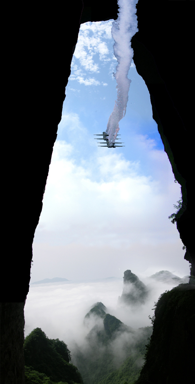 2006年3月,俄羅斯空軍“勇士”特技飛行表演隊,駕駛蘇27重型戰(zhàn)斗機飛臨天門山,欲完成一次不可思議的特技飛行表演,想創(chuàng)造出重型戰(zhàn)斗機穿越天門的挑戰(zhàn)奇跡。盡管因巨大的風險和輿論壓力最終放棄“穿越天門”的挑戰(zhàn),但俄羅斯空軍在天門山上空進行的精彩飛行表演仍然令人震撼。