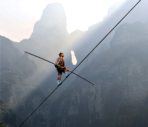 2008年10月,新疆達瓦孜絕技第七代傳人賽買提·艾山在天門山進行了空前難度的極限坡度高空走鋼絲行走挑戰(zhàn)。鋼絲架設(shè)在天門山奇峰絕嶺間,長700米,傾斜度達39°。此次挑戰(zhàn)的難度之大超乎想象,被眾人視為不可能完成的任務(wù)。賽買提最終功虧一簣,在離終點約60米處跌倒,但其勇氣和絕技令眾人折服。2009年4月,賽買提英雄歸來,再次挑戰(zhàn)這條鋼繩并終于成功,在天門山創(chuàng)造出世界高空鋼絲行走最具難度和風險的一次極限征服。