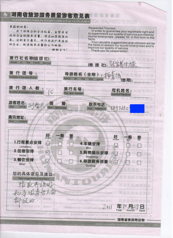 江蘇淮安劉先生10人旅游質(zhì)量回饋:張家界旅游楊導(dǎo)服務(wù)各方面都很好!