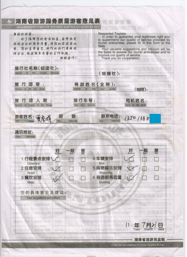 北京賈女士一行8人旅游質(zhì)量回饋