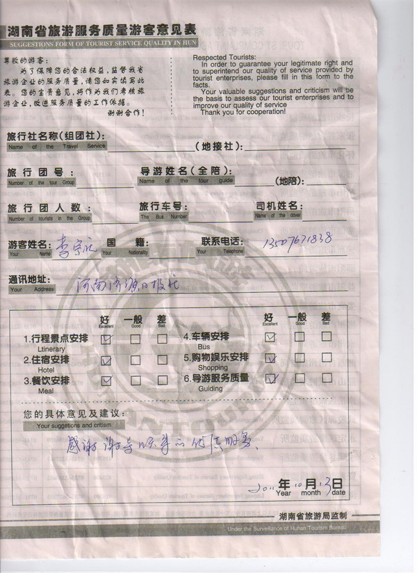 河南李先生一行39人旅游質(zhì)量回饋