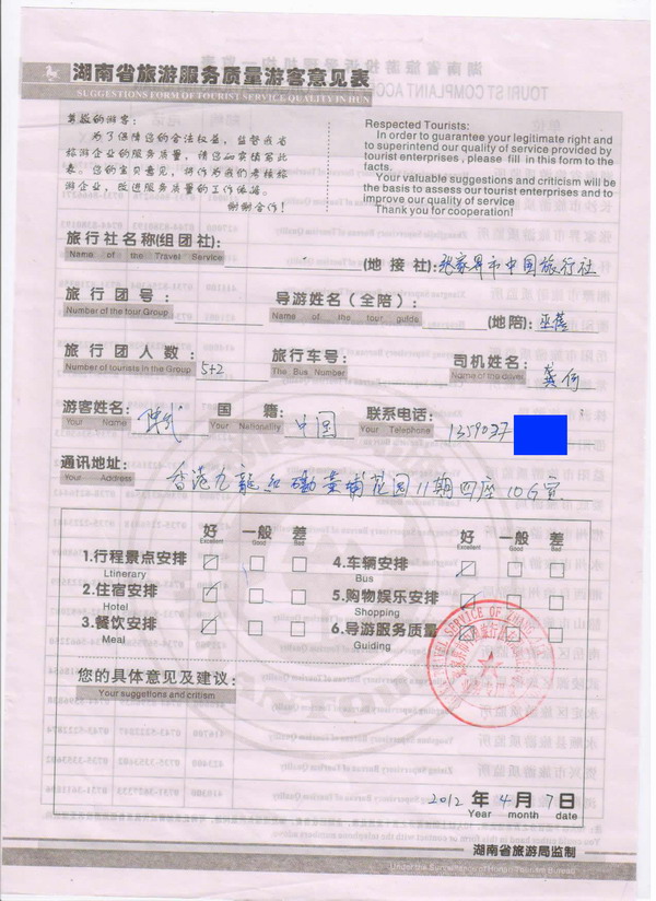 香港陳先生一行7人旅游質(zhì)量回饋