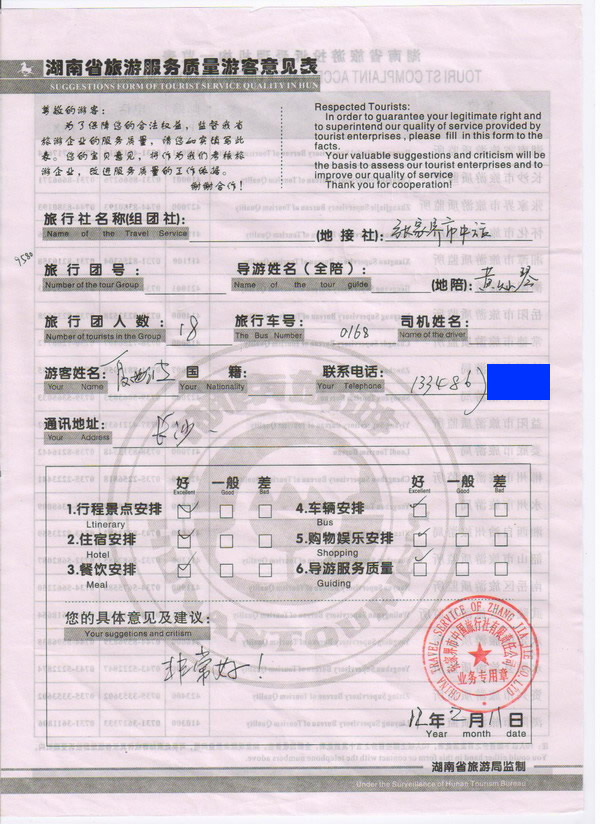 長沙夏先生一行18人旅游質量回饋