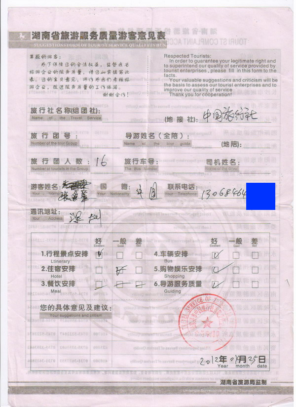 深圳張女士一行16人旅游質(zhì)量回饋
