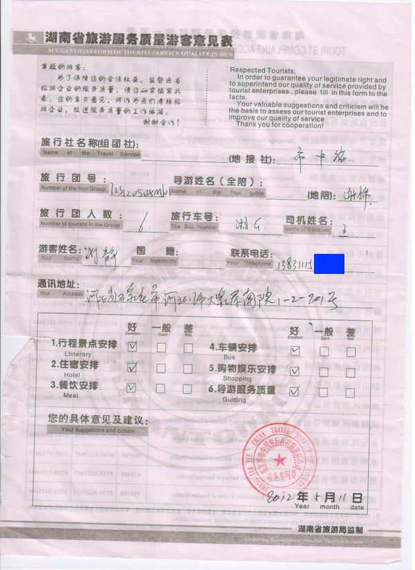 河北謝小姐一行6人旅游質(zhì)量回饋