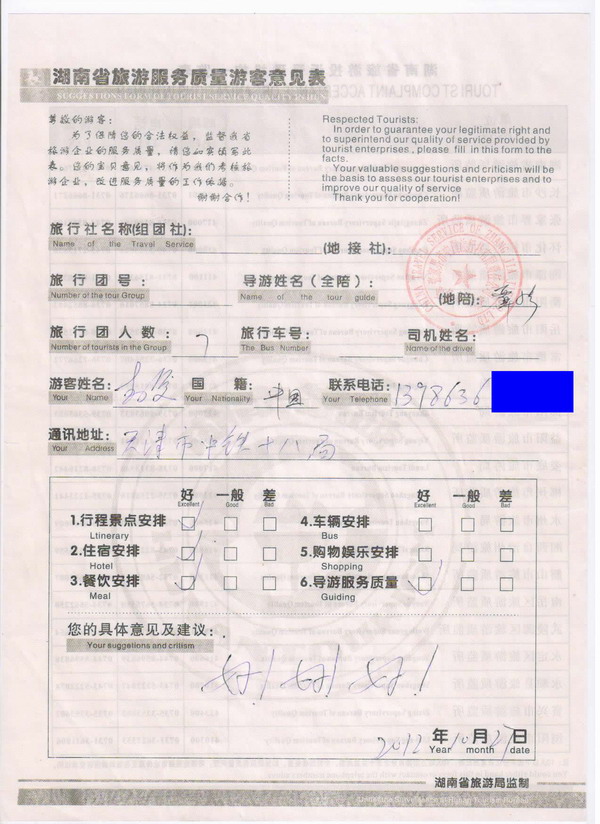 天津青先生一行7人旅游質(zhì)量回饋