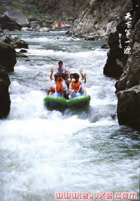天下第一漂從離王村古鎮(zhèn)十多公里的一個(gè)叫哈妮宮的地方開(kāi)始,那逼人的綠色,啁啾的鳥音,空靈的水聲便和著峽谷野風(fēng)撲面而來(lái),浸淫你每一寸肌膚。陽(yáng)光順著長(zhǎng)滿戟形葉片的古藤溜下來(lái),猛不丁地被突兀的崖石擊了一掌,扭曲著篩過(guò)蓊郁的枝葉,如一枚枚古幣般在綠得有些發(fā)藍(lán)的河上跳躍,閃著古老的光澤。沙灘、卵石、艾嵩、蒲草、漁歌和野性十足的流水,都在以最簡(jiǎn)單最直接的方式提醒你;上橡皮舟吧,去漂向神秘,漂向思緒的觸角還沒(méi)有過(guò)到的地方。