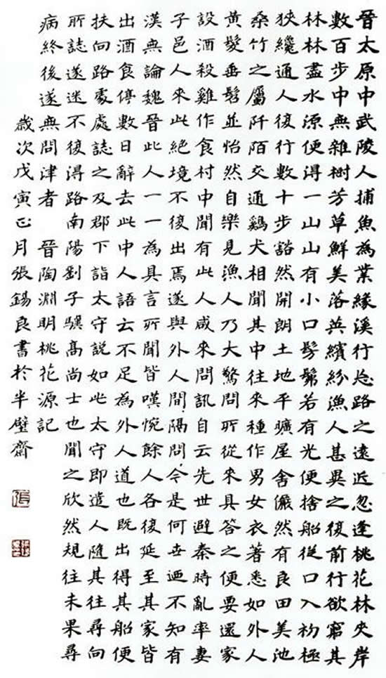 晉太元中,武陵人,捕魚為業(yè)。緣溪行,忘路之遠(yuǎn)近,忽逢桃花林。夾岸數(shù)百步,中無(wú)雜樹,方草鮮美,落英繽紛。漁人甚異之,復(fù)前行,欲窮其林。林盡水源,便得一山。山有小口,仿佛若有光。便舍船從口入,初極狹,才通人。復(fù)行數(shù)十步,豁然開朗。土地平曠,屋舍儼然,有良田美池桑竹之屬,阡陌交通,雞犬相聞。其中往來(lái)種作,男女衣著,悉如外人。黃發(fā)垂髫,并怡然自樂。見漁人,乃大驚,問所從來(lái),具答之。便要還家,設(shè)酒殺雞作食。村中聞?dòng)写巳,咸?lái)問訊。自云先世避秦時(shí)亂,率妻子邑人,來(lái)此絕境,不復(fù)出焉,遂與外人間隔。問今是何世,乃不知有漢,無(wú)論魏晉。此人一一為具言所聞,皆嘆惋。馀人各復(fù)延至其家,皆出酒食。停數(shù)日,辭去。此中人語(yǔ)云:“不足為外人道也”。既出,得其船,便扶向路,處處志之。及郡下,詣太守說(shuō)如此。太守即遣人隨其往,尋向所志,遂迷,不復(fù)得路。南陽(yáng)劉子驥,高尚士也,聞之,欣然規(guī)往,末果,尋病終。后遂無(wú)問津者。
