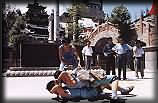 (2)臥刀破石:先固定兩把大刀,刀口朝上,臥刀者運(yùn)氣后,由其他人抬臥于刀口上(有仰臥、俯臥兩種),然后在臥刀者腹部或背部置一碩大石條(約數(shù)百斤),由一個(gè)或兩個(gè)彪形大漢掄大錘狠擊石條直至斷裂破碎為止。