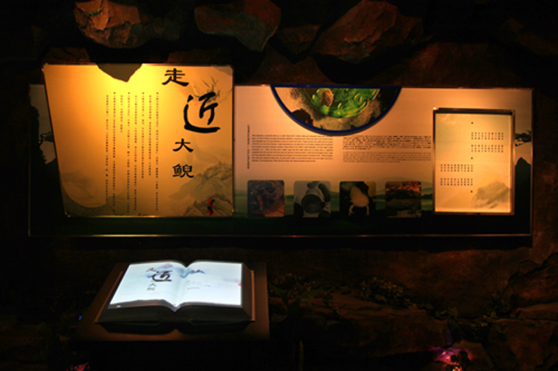 從影視廳出來(lái),步入大鯢文化展區(qū),展區(qū)入口處為一幅竹簡(jiǎn)長(zhǎng)卷,長(zhǎng)卷呈現(xiàn)了《西澤補(bǔ)遺》里所記載的《鯢志》全文。長(zhǎng)卷斜對(duì)面的展區(qū)以雕塑的形式詮釋了《鯢志》中送子魚的典故。與雕塑相接的是光雕形式的《鯢考》,呈現(xiàn)了戰(zhàn)國(guó)以來(lái)有關(guān)大鯢的古代文獻(xiàn),揭示了中國(guó)古代大鯢的分布、用途以及人工養(yǎng)殖的歷史。整個(gè)展區(qū)的右側(cè)為一太極書案,幾卷攤開(kāi)的竹簡(jiǎn)從案頭下垂到案基,竹簡(jiǎn)上篆刻了大鯢與道家思想淵源的文字,考證了太極拓?fù)洵h(huán)取形于大鯢外形的淵源。書案背后的墻上開(kāi)了幾扇土家族的花格窗,透過(guò)花格窗看到的是一則則道家故事的插圖。書案左手邊為一排美人靠,背景投影湖南鳳凰古城的風(fēng)貌的動(dòng)態(tài)視屏。書案右手邊為金屬珠簾,起到隔斷空間作用,透而不通。整個(gè)展區(qū),意在揭示大鯢與道家思想的淵源。